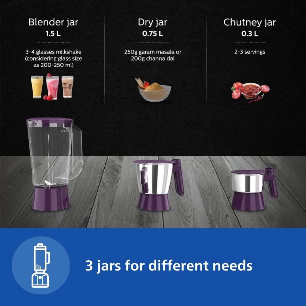 - 3 Jars: 1.5 L Blender Jar, 0.75 L Multipurpose jar,0.3 L chutney Jar