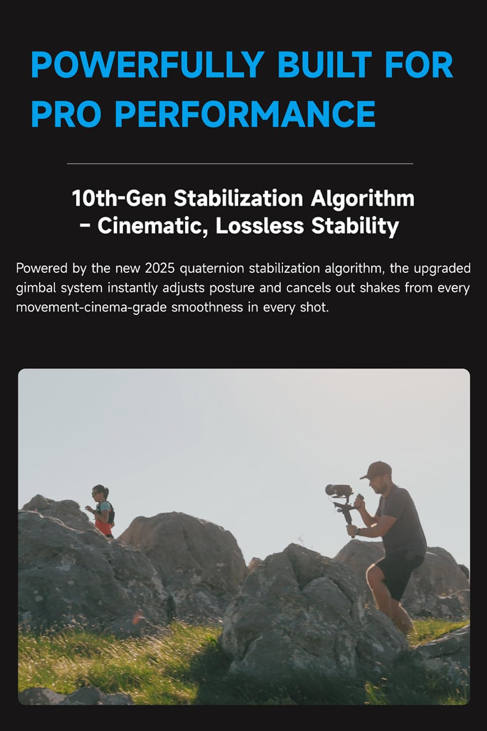 - Powerfully Built for Pro Performance : Powered by the new 2025 quaternion stabilization algorithm, the upgraded gimbal system instantly adjusts posture and cancels out shakes from every movement, delivering cinema-grade smoothness in every shot