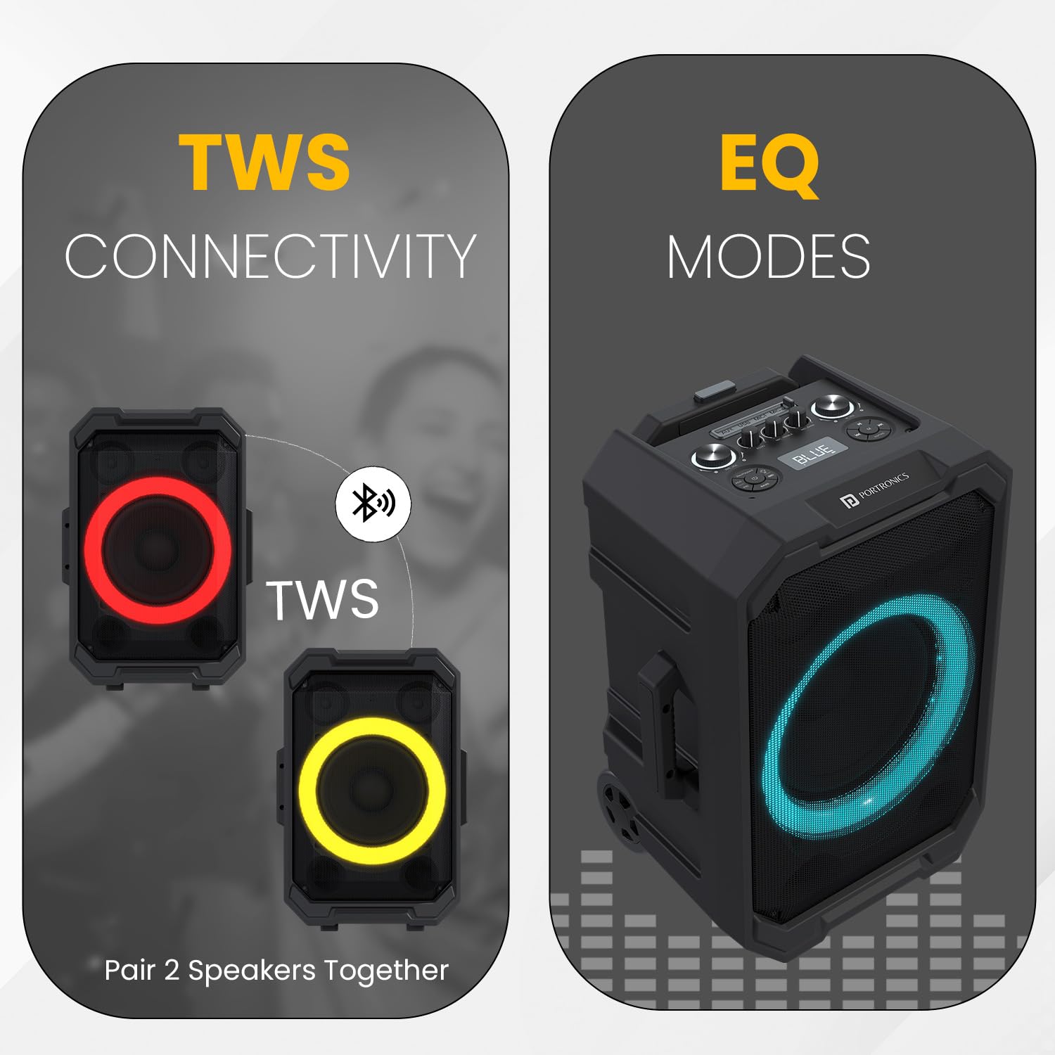 - Ultimate Portability with Wheels : Take the party anywhere with this Portronics bluetooth party speaker’s convenient trolley handles and wheels. Now it is easy to transport the music system from room to room or even outdoors for effortless entertainment on the go